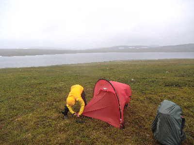 Vi fekk eit tips om å ta bussen opp på Sennalandet og gå derfrå. Dersom vi skulle gått frå Alta, måtte vi først gå sørover eit godt stykke, noko som fristar lite, ein kort halvtime med buss over tregrensa er nok det smartaste, så slepp vi milevis med asfalttraking og! Vi går av bussen ved Bigas, det bles kraftig, bra! Då held myggen seg vekke. Vi set kursen opp på fjellet i eit bedageleg tempo, klokka er ca 14 og vi har ikkje tenkt oss så langt denna første dagen, berre inn i fjellet. Etter litt over ein time i vind og høljeregn, finn vi ein fin campingplass, lyng ;-) det er godt å kjenne lukta av lyngen att og vi får med litt makt sett opp telta mot vinden! Det regnar og vi er trøytte. Inn i teltet og lese litt til regnet gjer seg :-) Digg digg! Begge to sovnar raskt og vaknar av at vinden bles teltduken i trynet på oss, hmm.. Vinden har snudd og det har slutta å regne, her er det berre å kome seg ut å snu teltet. Vi kokar opp vatn og tek med oss realen inn i telta. Trøtte som vi er etter bydagane sovnar vi tidleg! Pluggar i øyreproppane og ignorerar at vinden snur iløpe av kvelden og natta. ;-)